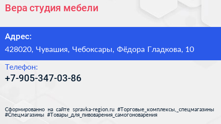 Вера, студия мебели по адресу 428020, Чувашия, Чебоксары, Фёдора Гладкова, 10 в дальнейшем Организация, размещена в следующих категориях: