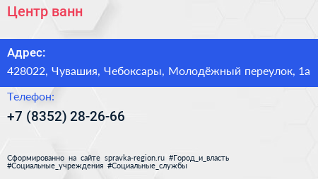 Центр ванн по адресу 428022, Чувашия, Чебоксары, Молодёжный переулок, 1а в дальнейшем Организация, размещена в следующих категориях: