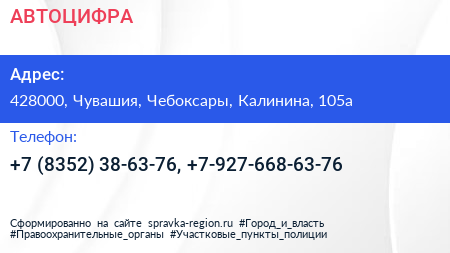 АВТОЦИФРА по адресу 428000, Чувашия, Чебоксары, Калинина, 105а в дальнейшем Организация, размещена в следующих категориях: