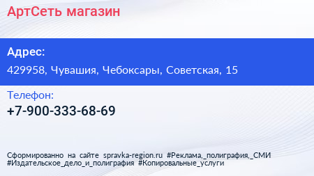 АртСеть, магазин по адресу 429958, Чувашия, Чебоксары, Советская, 15 в дальнейшем Организация, размещена в следующих категориях: