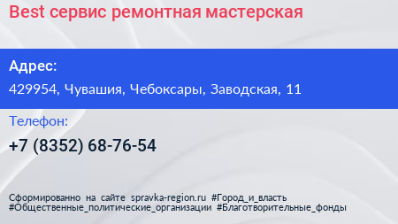 Best сервис, ремонтная мастерская по адресу 429954, Чувашия, Чебоксары, Заводская, 11 в дальнейшем Организация, размещена в следующих категориях: