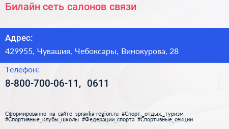 Билайн, сеть салонов связи по адресу 429955, Чувашия, Чебоксары, Винокурова, 28 в дальнейшем Организация, размещена в следующих категориях: