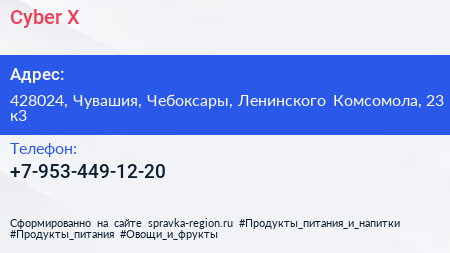 Cyber X по адресу 428024, Чувашия, Чебоксары, Ленинского Комсомола, 23 к3 в дальнейшем Организация, размещена в следующих категориях: