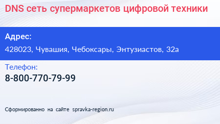 DNS, сеть супермаркетов цифровой техники по адресу 428023, Чувашия, Чебоксары, Энтузиастов, 32а в дальнейшем Организация, размещена в следующих категориях: