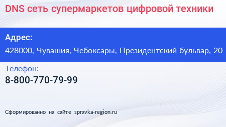 DNS, сеть супермаркетов цифровой техники по адресу 428000, Чувашия, Чебоксары, Президентский бульвар, 20 в дальнейшем Организация, размещена в следующих категориях: