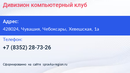 Дивизион, компьютерный клуб по адресу 428024, Чувашия, Чебоксары, Хевешская, 1а в дальнейшем Организация, размещена в следующих категориях: