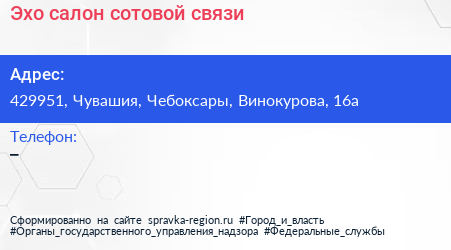 Эхо, салон сотовой связи по адресу 429951, Чувашия, Чебоксары, Винокурова, 16а в дальнейшем Организация, размещена в следующих категориях: