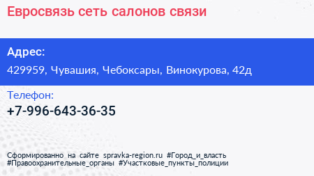 Евросвязь, сеть салонов связи по адресу 429959, Чувашия, Чебоксары, Винокурова, 42д в дальнейшем Организация, размещена в следующих категориях: