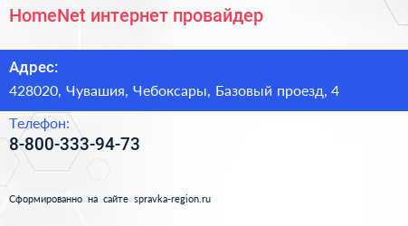 HomeNet, интернет-провайдер по адресу 428020, Чувашия, Чебоксары, Базовый проезд, 4 в дальнейшем Организация, размещена в следующих категориях: