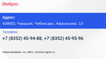 Инбрэс по адресу 428003, Чувашия, Чебоксары, Афанасьева, 13 в дальнейшем Организация, размещена в следующих категориях: