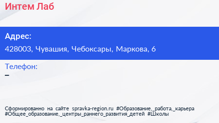 Интем Лаб по адресу 428003, Чувашия, Чебоксары, Маркова, 6 в дальнейшем Организация, размещена в следующих категориях: