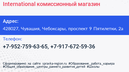 International, комиссионный магазин по адресу 428027, Чувашия, Чебоксары, проспект 9 Пятилетки, 2а в дальнейшем Организация, размещена в следующих категориях: