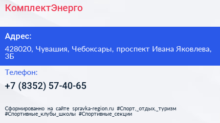 КомплектЭнерго по адресу 428020, Чувашия, Чебоксары, проспект Ивана Яковлева, 3Б в дальнейшем Организация, размещена в следующих категориях: