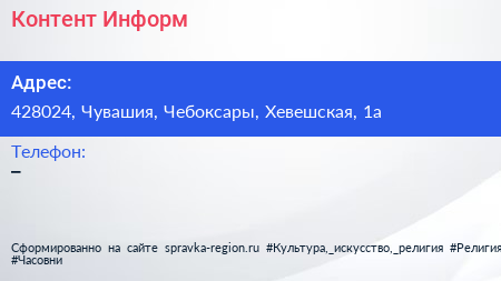 Контент Информ по адресу 428024, Чувашия, Чебоксары, Хевешская, 1а в дальнейшем Организация, размещена в следующих категориях:
