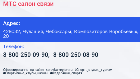 МТС, салон связи по адресу 428032, Чувашия, Чебоксары, Композиторов Воробьёвых, 20 в дальнейшем Организация, размещена в следующих категориях: