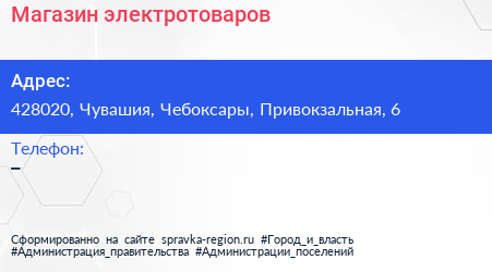 Магазин электротоваров по адресу 428020, Чувашия, Чебоксары, Привокзальная, 6 в дальнейшем Организация, размещена в следующих категориях: