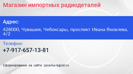 Магазин импортных радиодеталей по адресу 428000, Чувашия, Чебоксары, проспект Ивана Яковлева, 4/2 в дальнейшем Организация, размещена в следующих категориях: