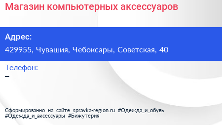 Магазин компьютерных аксессуаров по адресу 429955, Чувашия, Чебоксары, Советская, 40 в дальнейшем Организация, размещена в следующих категориях: