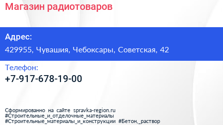 Магазин радиотоваров по адресу 429955, Чувашия, Чебоксары, Советская, 42 в дальнейшем Организация, размещена в следующих категориях: