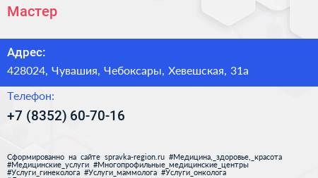 Мастер+ по адресу 428024, Чувашия, Чебоксары, Хевешская, 31а в дальнейшем Организация, размещена в следующих категориях: