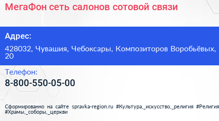 МегаФон, сеть салонов сотовой связи по адресу 428032, Чувашия, Чебоксары, Композиторов Воробьёвых, 20 в дальнейшем Организация, размещена в следующих категориях: