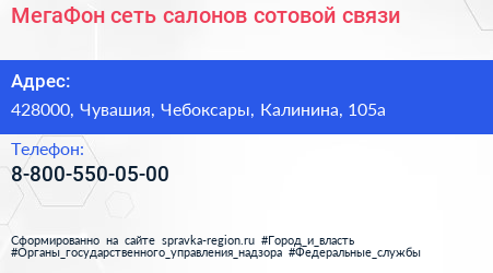 МегаФон, сеть салонов сотовой связи по адресу 428000, Чувашия, Чебоксары, Калинина, 105а в дальнейшем Организация, размещена в следующих категориях: