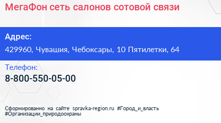 МегаФон, сеть салонов сотовой связи по адресу 429960, Чувашия, Чебоксары, 10 Пятилетки, 64 в дальнейшем Организация, размещена в следующих категориях: