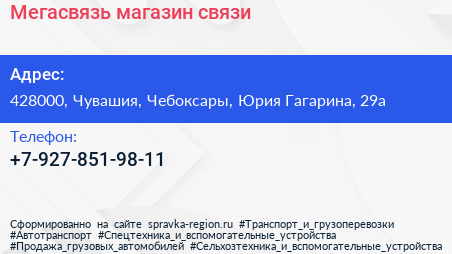 Мегасвязь, магазин связи по адресу 428000, Чувашия, Чебоксары, Юрия Гагарина, 29а в дальнейшем Организация, размещена в следующих категориях: