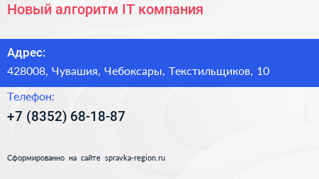 Новый алгоритм, IT-компания по адресу 428008, Чувашия, Чебоксары, Текстильщиков, 10 в дальнейшем Организация, размещена в следующих категориях: