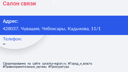 Салон связи по адресу 428037, Чувашия, Чебоксары, Кадыкова, 11/1 в дальнейшем Организация, размещена в следующих категориях: