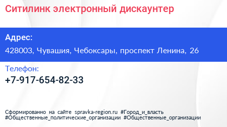 Ситилинк, электронный дискаунтер по адресу 428003, Чувашия, Чебоксары, проспект Ленина, 26 в дальнейшем Организация, размещена в следующих категориях: