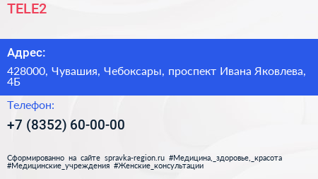 TELE2 по адресу 428000, Чувашия, Чебоксары, проспект Ивана Яковлева, 4Б в дальнейшем Организация, размещена в следующих категориях: