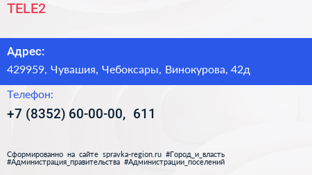 TELE2 по адресу 429959, Чувашия, Чебоксары, Винокурова, 42д в дальнейшем Организация, размещена в следующих категориях: