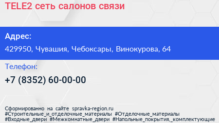 TELE2, сеть салонов связи по адресу 429950, Чувашия, Чебоксары, Винокурова, 64 в дальнейшем Организация, размещена в следующих категориях: