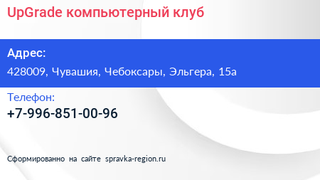 UpGrade, компьютерный клуб по адресу 428009, Чувашия, Чебоксары, Эльгера, 15а в дальнейшем Организация, размещена в следующих категориях: