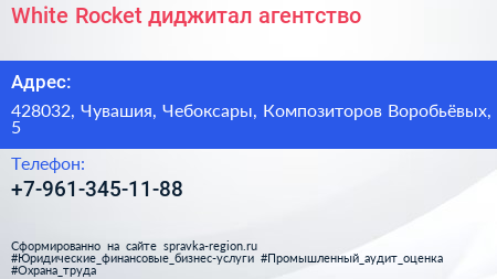 White Rocket, диджитал-агентство по адресу 428032, Чувашия, Чебоксары, Композиторов Воробьёвых, 5 в дальнейшем Организация, размещена в следующих категориях: