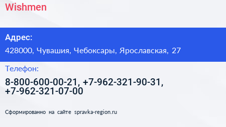 Wishmen по адресу 428000, Чувашия, Чебоксары, Ярославская, 27 в дальнейшем Организация, размещена в следующих категориях: