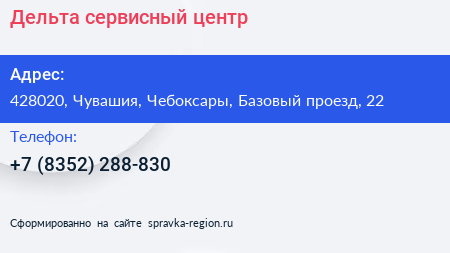 Дельта, сервисный центр по адресу 428020, Чувашия, Чебоксары, Базовый проезд, 22 в дальнейшем Организация, размещена в следующих категориях: