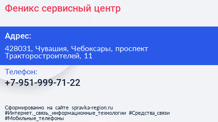 Феникс, сервисный центр по адресу 428031, Чувашия, Чебоксары, проспект Тракторостроителей, 11 в дальнейшем Организация, размещена в следующих категориях: