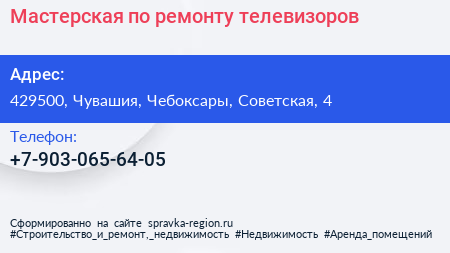 Мастерская по ремонту телевизоров по адресу 429500, Чувашия, Чебоксары, Советская, 4 в дальнейшем Организация, размещена в следующих категориях: