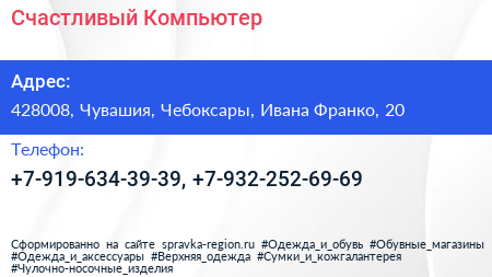 Счастливый Компьютер по адресу 428008, Чувашия, Чебоксары, Ивана Франко, 20 в дальнейшем Организация, размещена в следующих категориях: