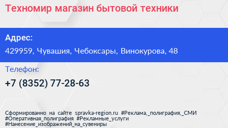 Техномир, магазин бытовой техники по адресу 429959, Чувашия, Чебоксары, Винокурова, 48 в дальнейшем Организация, размещена в следующих категориях: