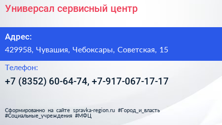 Универсал, сервисный центр по адресу 429958, Чувашия, Чебоксары, Советская, 15 в дальнейшем Организация, размещена в следующих категориях: