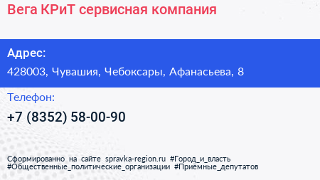Вега-КРиТ, сервисная компания по адресу 428003, Чувашия, Чебоксары, Афанасьева, 8 в дальнейшем Организация, размещена в следующих категориях: