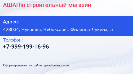 АШАНin, строительный магазин по адресу 428034, Чувашия, Чебоксары, Филиппа Лукина, 5 в дальнейшем Организация, размещена в следующих категориях: