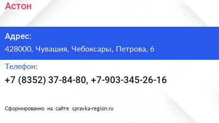Астон по адресу 428000, Чувашия, Чебоксары, Петрова, 6 в дальнейшем Организация, размещена в следующих категориях: