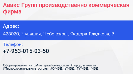 Авакс-Групп, производственно-коммерческая фирма по адресу 428020, Чувашия, Чебоксары, Фёдора Гладкова, 9 в дальнейшем Организация, размещена в следующих категориях: