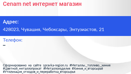 Cenam.net, интернет-магазин по адресу 428023, Чувашия, Чебоксары, Энтузиастов, 21 в дальнейшем Организация, размещена в следующих категориях:
