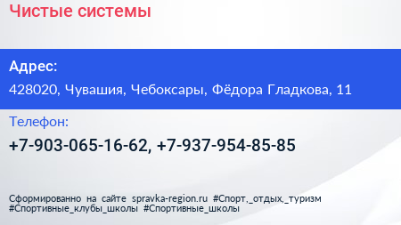 Чистые системы по адресу 428020, Чувашия, Чебоксары, Фёдора Гладкова, 11 в дальнейшем Организация, размещена в следующих категориях:
