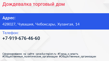 Дождевалка, торговый дом по адресу 428027, Чувашия, Чебоксары, Хузангая, 14 в дальнейшем Организация, размещена в следующих категориях: